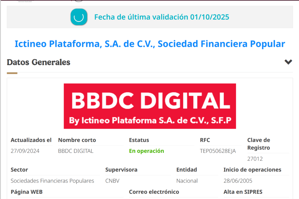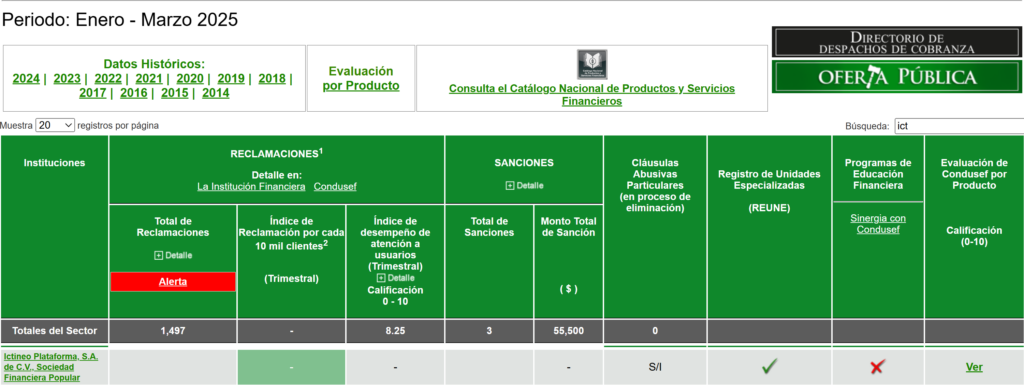 La información asentada en la presente página, únicamente corresponde a Prestaciones Ictineo Plataforma, S. A. de C. V. SFP, por lo que para conocer la información de todo el sector de “SOFIPOS”, se podrá acceder al sitio: http://www.buro.gob.mx